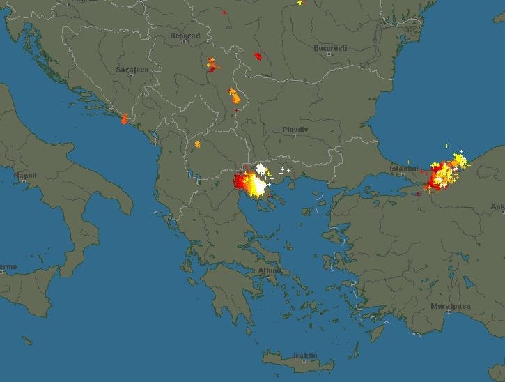 Χάρτης Ηλεκτρικών Εκκενώσεων (αστραπών) αυτή την ώρα (00.22) Βλέπουμε ότι τα ηλεκτρικά φαινόμενα στη χώρα μας, εντοπίζονται, στην Κεντρική Μακεδονία και συγκεκριμένα στους νομούς, Θεσσαλονίκης, Κιλκίς, Χαλκιδικής και Σερρών....