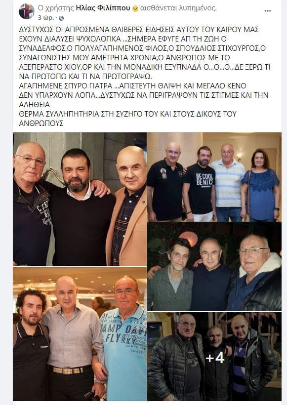 «Δυστυχώς οι απρόσμενα θλιβερές ειδήσεις αυτού του καιρού μας έχουν διαλύσει ψυχολογικά …Σήμερα έφυγε από τη ζωή ο συνάδελφος πολυαγαπημένος φίλος σπουδαίος στιχουργός συναγωνιστής μου αμέτρητα χρόνια άνθρωπος με το αξεπέραστο χιούμορ και τη μοναδική εξυπνάδα ο…ο…ο…δε ξέρω τι να πρωτοπώ και τι να πρωτογράψω. Αγαπημένε Σπύρο Γιατρά …απίστευτη θλίψη και μεγάλο κενό δεν υπάρχουν λόγια…δυστυχώς να περιγράψουν τις στιγμές και την αλήθεια θερμά συλλυπητήρια στη σύζυγο του και στους δικούς του ανθρώπους», έγραψε ο ίδιος.