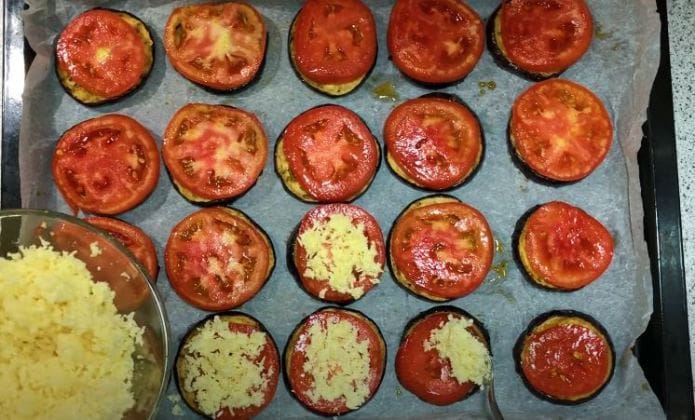 Ψήνουμε 15 λεπτά στους 200 βαθμούς βγάζουμε το ταψί και μοιράζουμε μία φέτα τομάτα πάνω σε κάθε μελιτζάνα.