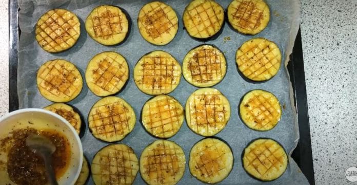 Τοποθετούμε τις μελιτζάνες σε ένα ταψί στρωμένο σε χαρτί ψησίματος και τις αλείφουμε με όλο το μείγμα λαδιού-σκόρδου.