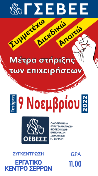 Σε αυτό το πλαίσιο η ΟΕΒΕΣΣ, με απόφαση του Προεδρείου της που συνεδρίασε την Δευτέρα 24/10/22, αποφάσισε να συμμετάσχει στις κινητοποιήσεις που έχουν καθοριστεί για την Τετάρτη 09 Νοεμβρίου 2022, από κοινού με το Εργατικό Κέντρο Σερρών, τους εργαζόμενους του Ιδιωτικού & Δημοσίου Τομέα και τους επαγγελματίες των Σερρών, ώστε να ληφθούν αποτελεσματικά μέτρα έναντι της ακρίβειας και της υπερχρέωσης.