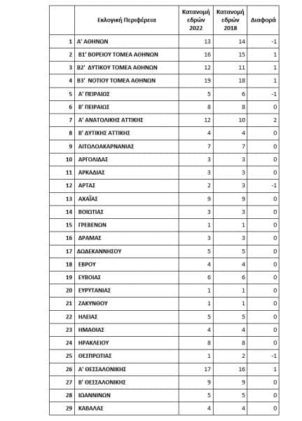 Ακολουθεί ο πίνακας με την κατανομή των εδρών που διαμορφώνει τον νέο εκλογικό χάρτη της χώρας για την επόμενη εκλογική διαδικασία. Ο νομός Σερρών χάνει μια έδρα και από τις 6 πάει στις 5.