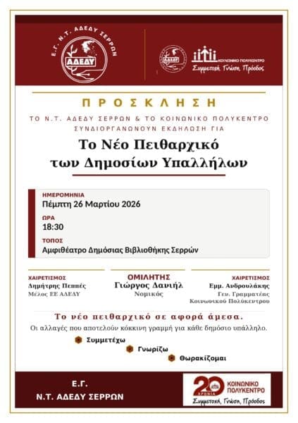 Το Ν.Τ. ΑΔΕΔΥ Σερρών, σε συνεργασία με το Κοινωνικό Πολύκεντρο, διοργανώνει μια κρίσιμη ενημερωτική εκδήλωση με θέμα: