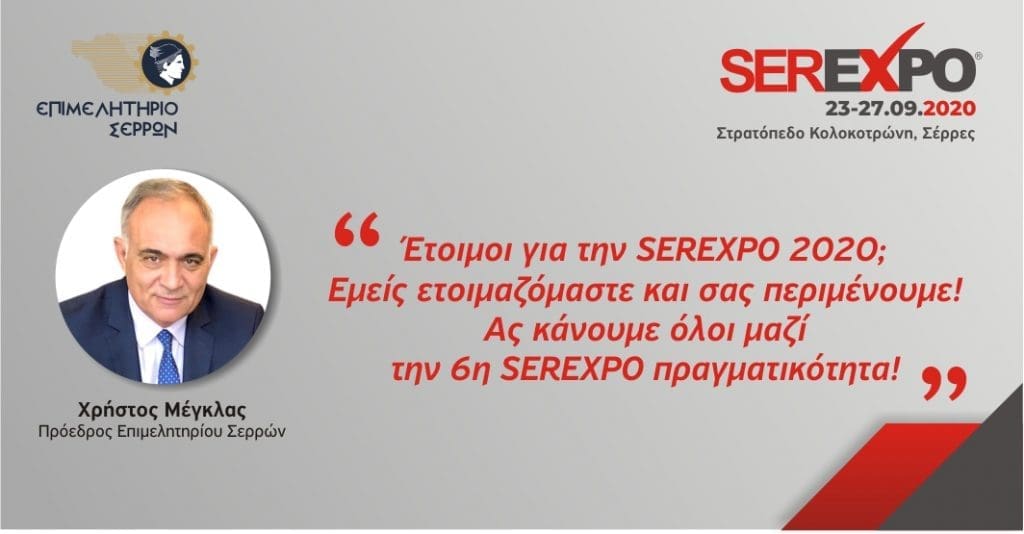 «Με αίσθημα ευθύνης και κύριο μέλημά μας την προστασία της δημόσιας υγείας αποφασίστηκε η αναβολή της 6ης SEREXPO, που θα πραγματοποιούνταν από το Επιμελητήριο Σερρών σε συνδιοργάνωση με την Π.Ε. Σερρών από τις 23 έως και τις 27 Σεπτεμβρίου 2020.
