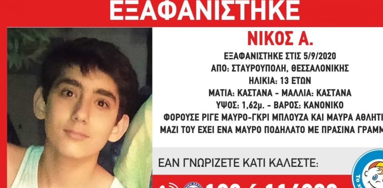 Στις 05/09/2020, πρωινές ώρες, εξαφανίστηκε από την περιοχή Σταυρούπολη της Θεσσαλονίκης, ο Νίκος Α., 13 ετών.