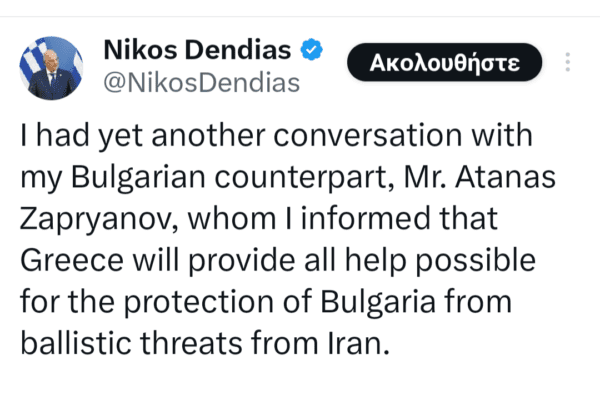 Πυροβολαρχία Patriot και ζεύγος F-16 θα μεταφερθούν στη Βόρεια Ελλάδα για την αντιβαλλιστική κάλυψη μεγάλου τμήματος της επικράτειας της Βουλγαρίας, όπως δήλωσε ο υπουργός Εθνικής Άμυνας, Νίκος Δένδιας. Ο ίδιος νωρίτερα είχε τηλεφωνική επικοινωνία με τον Βούλγαρο ομόλογό του, Ατανάς Ζαπριάνοφ.