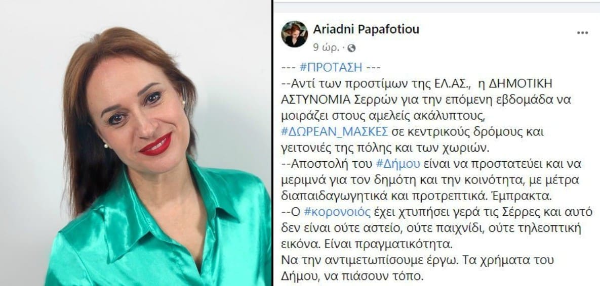 Την διανομή δωρεάν μασκών στους πολίτες των Σερρών, αντί προστίμων, υποστηρίζει η επικεφαλής της παράταξης “Δύναμη Σερραίων¨Αριάδνη Παπαφωτίου.