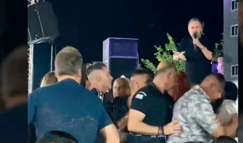 Όπως φαίνεται σε ένα βίντεο που κάνει τον γύρο των social media, κάποιοι παρευρισκόμενοι όρθιοι στην πίστα μπροστά από τον τραγουδιστή αρχίζουν να διαπληκτιζονται και να πέφτουν και μερικές… ψιλές με αποτέλεσμα να εκνευριστεί ο τραγουδιστής και να ζητήσει να τους απομακρύνουν από τον χώρο.