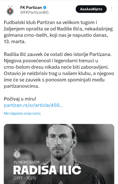 Η Παρτιζάν αποχαιρέτησε με μία συγκινητική ανάρτηση τον Ίλιτς: