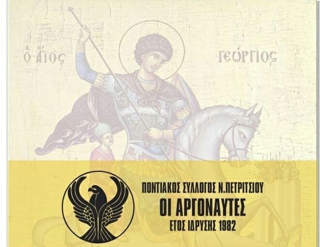 Ο ποντιακός σύλλογος Πετριτσίου “Οι Αργοναύτες” διοργανώνει την καθιερωμένη εκδήλωση προς τιμήν του Αγίου Γεωργίου η οποία θα πραγματοποιηθεί στις 6 Μαΐου και ώρα 12:00 το μεσημέρι στον προαύλιο χώρο του Ιερού Ναού Αγίου Γεωργίου στο Νέο Πετρίτσι. Ένα ποντιακό γλέντι που θα λάβει χώρα προς τιμήν του Αγίου μας με φαγητό ποτό......