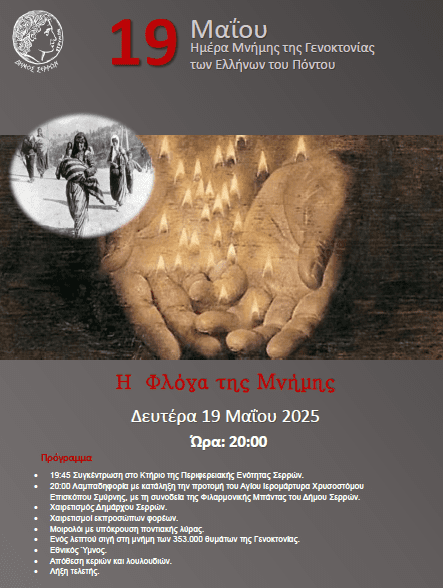 Ο Δήμος Σερρών τιμώντας την 106η πένθιμη επέτειο της Γενοκτονίας των Ελλήνων του Πόντου, ανάβει τη «ΦΛΟΓΑ της ΜΝΗΜΗΣ», το βράδυ της Δευτέρας 19 Μαΐου 2025 και προσκαλεί τους Ποντιακούς, αλλά και εν γένει τους Προσφυγικούς Πολιτιστικούς Συλλόγους του Δήμου, όλους τους φορείς πολιτισμού, τους εκπαιδευτικούς και αθλητικούς φορείς, την τοπική κοινωνία και τους/-τις νέους/-νέες, να κρατήσουν άσβεστη τη Φλόγα της Μνήμης και να αποτίσουν με την παρουσία τους τον οφειλόμενο φόρο τιμής στα 353.000 θύματα της Γενοκτονίας των Ελλήνων του Πόντου.