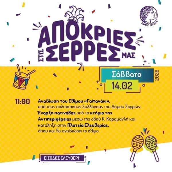 Ο Δήμος Σερρών, στο πλαίσιο των αποκριάτικων εκδηλώσεων, διοργανώνει το Σάββατο 14 Φεβρουαρίου 2026 και ώρα 11:00, την αναβίωση του παραδοσιακού εθίμου «Γαϊτανάκι», με τη συμμετοχή των πολιτιστικών συλλόγων.