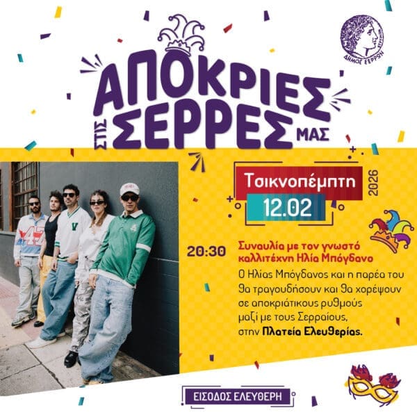 Ο Δήμος Σερρών προσκαλεί μικρούς και μεγάλους σε μία μεγάλη αποκριάτικη γιορτή γεμάτη μουσική, χορό, χρώμα και χαμόγελα, στην «καρδιά» της πόλης των Σερρών.