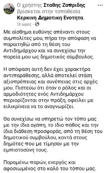 ›Με αίσθημα ευθύνης απέναντι στους συμπολίτες μου, πήρα την απόφαση να παραιτηθώ από τη θέση του Αντιδημάρχου και να συνεχίσω την πορεία μου ως δημοτικός σύμβουλος.