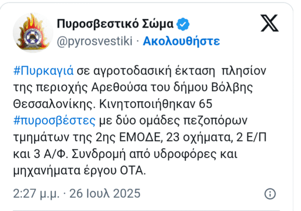 Φωτιά ξέσπασε το μεσημέρι του Σαββάτου (26 Ιουλίου) σε αγροτοδασική έκταση στην περιοχή Αρεθούσα του δήμου Βόλβης, στη Θεσσαλονίκη, κινητοποιώντας ισχυρές πυροσβεστικές δυνάμεις.