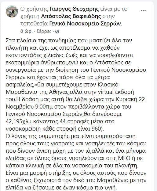 Στα πλαίσια της πανδημίας που μαστίζει όλο τον πλανήτη και έχει ως αποτέλεσμα να χαθούν εκαντοντάδες χιλιάδες ζωές και να νοσηλεύονται εκατομμύρια άνθρωποι, εγώ και ο Απόστολος σε συνεργασία με την διοίκηση του Γενικού Νοσοκομείου Σερρων και έχοντας πάρει όλα τα μέτρα ασφαλείας,»θα συμμετέχουμε στον Κλασικό Μαραθώνιο της Αθήνας, αλλά στην virtual έκδοσή του. Η δράση μας αυτή θα λάβει χώρα την Κυριακή 22 Νοεμβρίου 9:00πμ στον περιβάλλοντα χώρο του Γενικού Νοσοκομείου Σερρών, θα διανύσουμε 42,195χλμ κάνοντας 44 στροφές μέσα στο νοσοκομείο(η κάθε στροφή είναι 960).