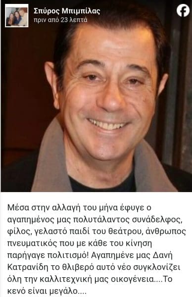 «Μέσα στην αλλαγή του μήνα έφυγε ο αγαπημένος μας πολυτάλαντος συνάδελφος, φίλος, γελαστό παιδί του θεάτρου, άνθρωπος πνευματικός που με κάθε του κίνηση παρήγαγε πολιτισμό! Αγαπημένε μας Δάνη Κατρανίδη το θλιβερό αυτό νέο συγκλονίζει όλη την καλλιτεχνική μας οικογένεια… Το κενό είναι μεγάλο…» έγραψε χαρακτηριστικά ο ηθοποιός και βουλευτής, Σπύρος Μπιμπίλας.