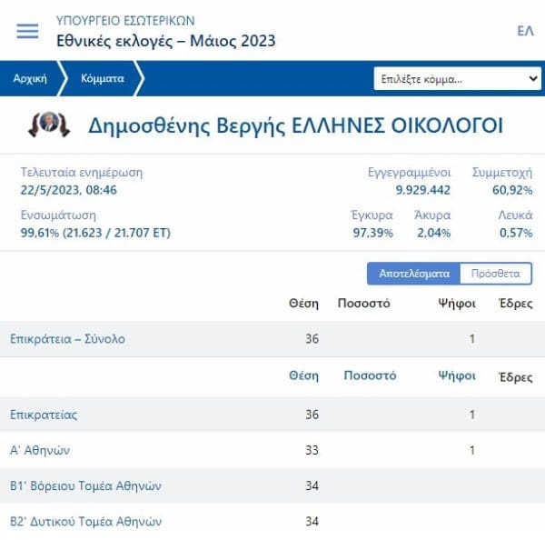 Πρόκειται για το κόμμα του Δημοσθένη Βεργή, «ΕΛΛΗΝΕΣ ΟΙΚΟΛΟΓΟΙ», που πήρε μόνο μια ψήφο στην Α’ Αθηνών.