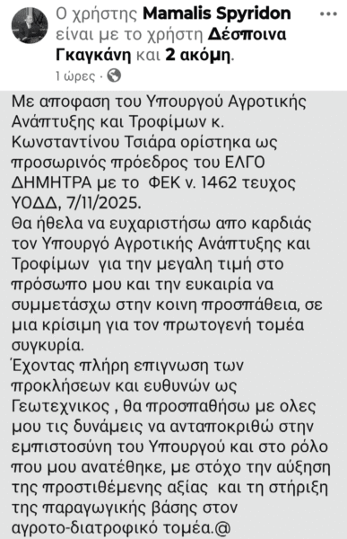 «Με απόφαση του Υπουργού Αγροτικής Ανάπτυξης και Τροφίμων κ. Κωνσταντίνου Τσιάρα ορίστηκα ως προσωρινός πρόεδρος του ΕΛΓΟ ΔΗΜΗΤΡΑ με το ΦΕΚ ν. 1462, τεύχος ΥΟΔΔ, 7/11/2025.