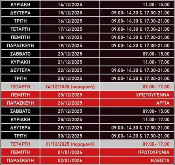 - Παρασκευή 19/12/2025: 09:00–14:30 και 17:30–21:00