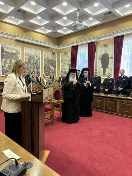«Σήμερα είναι μια ιδιαίτερα σημαντική ημέρα για τον Δήμο μας, καθώς έχουμε την τιμή να ανακηρύξουμε τον Μακαριώτατο Αρχιεπίσκοπο Νέας Ιουστινιανής και πάσης Κύπρου, κ. κ. Γεώργιο, σε επίτιμο δημότη του Δήμου Σερρών. Ο Μακαριώτατος, μέσα από το πνευματικό και κοινωνικό του έργο, έχει συμβάλει στην ενίσχυση των αξιών της πίστης, της αγάπης και της αλληλεγγύης.. Η ανακήρυξή του σε επίτιμο δημότη του Δήμου Σερρών αποδεικνύει την εκτίμησή μας προς το έργο του και τη δέσμευσή μας για συνεργασία και με την Εκκλησία της Κύπρου. Σε μια εποχή που οι προκλήσεις είναι πολλές, η πνευματική καθοδήγηση και η ηθική στήριξη που προσφέρει είναι αναγκαίες περισσότερο από ποτέ» ανέφερε η Δήμαρχος Σερρών και συνέχισε: «Η τιμή στο πρόσωπό σας είναι τιμή και στον Κυπριακό λαό, ενός λαού που αγωνίζεται για την ελευθερία και τη δικαιοσύνη. Πριν 50 χρόνια η Κύπρος βρέθηκε αντιμέτωπη με μια «θύελλα», που την οδήγησε σε διχοτόμηση. Κατά τη διάρκεια της τουρκικής εισβολής, άνθρωποι έχασαν τις ζωές τους, οικογένειες διασπάστηκαν και ορισμένοι αναζητούν να βρουν ακόμη τους συγγενείς τους. Η μνήμη των θυμάτων και των προσφύγων είναι ζωντανή και οι προσπάθειες για επανένωση και συμφιλίωση συνεχίζονται. Ο λαός της Κύπρου, μας διδάσκει ότι η ειρήνη, η δικαιοσύνη και η ελευθερία απαιτούν συνεχή αγώνα και προσήλωση. Μακαριώτατε σας καλωσορίζουμε στην οικογένεια του Δήμου Σερρών και σας ευχόμαστε ο Κύριος να σας χαρίζει έτη πολλά, υγεία και δύναμη στο έργο σας» υπογράμμισε ο κ. Μητλιάγκα.