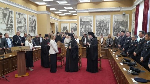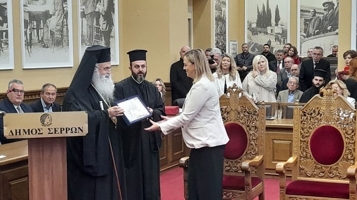 Κατά την διάρκεια της συνεδρίασης, η Δήμαρχος Σερρών κ. Βαρβάρα Μητλιάγκα επέδωσε στον Μακαριώτατο Αρχιεπίσκοπο Νέας Ιουστινιανής και πάσης Κύπρου κ.κ. Γεώργιο τον Χρυσό Σταυρό των Αγίων Θεοδώρων, που αποτελεί την ανώτατη τιμητική διάκριση του Δήμου Σερρών.