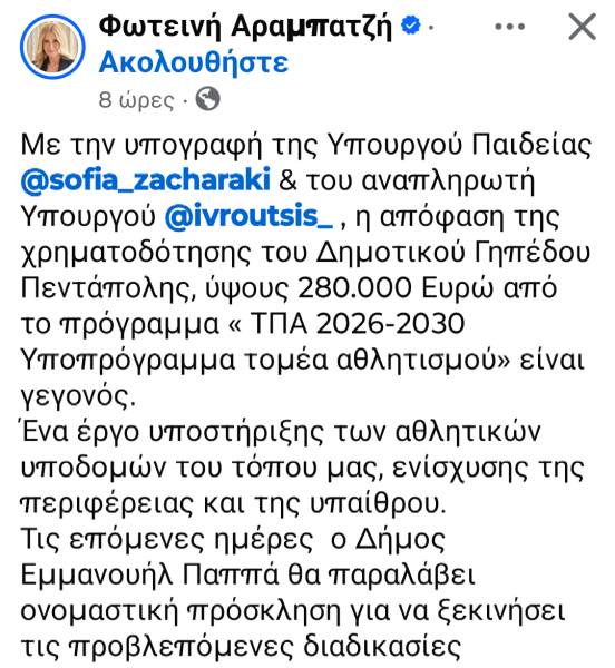 «Με την υπογραφή της Υπουργού Παιδείας @sofia_zacharaki & του αναπληρωτή Υπουργού @ivroutsis_ , η απόφαση της χρηματοδότησης του Δημοτικού Γηπέδου Πεντάπολης, ύψους 280.000 Ευρώ από το πρόγραμμα « ΤΠΑ 2026-2030 Υποπρόγραμμα τομέα αθλητισμού» είναι γεγονός.