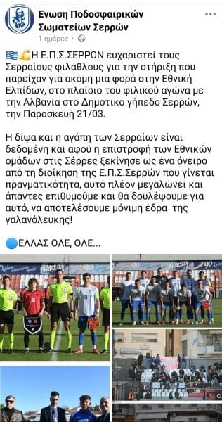 Η Ε.Π.Σ.ΣΕΡΡΩΝ ευχαριστεί τους Σερραίους φιλάθλους για την στήριξη που παρείχαν για ακόμη μια φορά στην Εθνική Ελπίδων, στο πλαίσιο του φιλικού αγώνα με την Αλβανία (0-0) στο Δημοτικό γήπεδο Σερρών, την Παρασκευή 21/03.