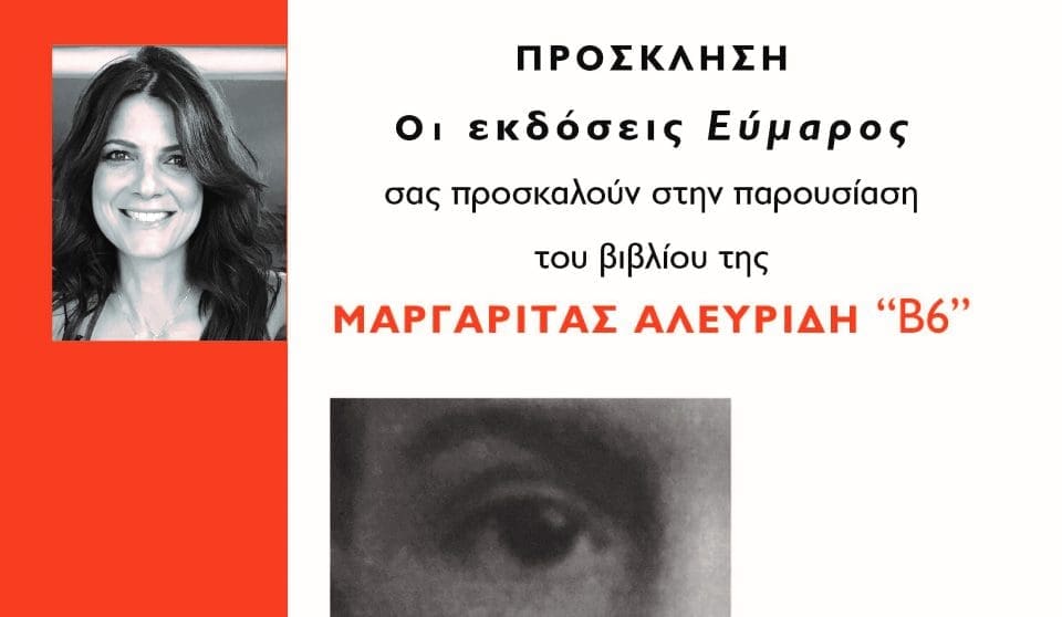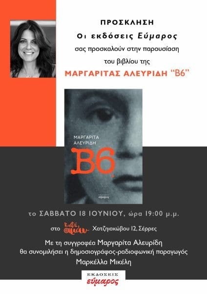 Η συγγραφέας Μαργαρίτα Αλευρίδη θα βρίσκεται στις 7 το απόγευμα του Σαββάτου 18 Ιουνίου 2022 στις Σέρρες και συγκεκριμένα στο «καφέ αμάν» (Χατζηιακώβου 12) για την παρουσίαση του βιβλίου της Β6 που κυκλοφορεί από τις Εκδόσεις Εύμαρος. Για το βιβλίο θα μιλήσει η δημοσιογράφος και ραδιοφωνική παραγωγός Μαρκέλλα Μικέλη.