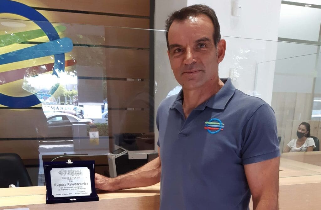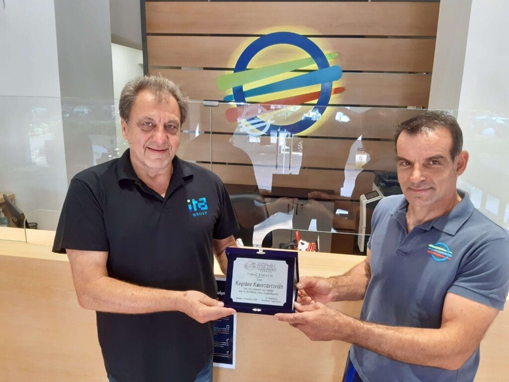 Εκπροσωπώντας τον όμιλο ΙΤΑ, ο διευθύνων σύμβουλος της ΘΕΡΜΗ ΣΕΡΡΩΝ Α.Ε., Ιωάννης Μυλωνάκης, συνεχάρη τον Κυριάκο Κωνσταντινίδη για την ηρωική του πράξη και του απένειμε ειδική τιμητική πλακέτα.