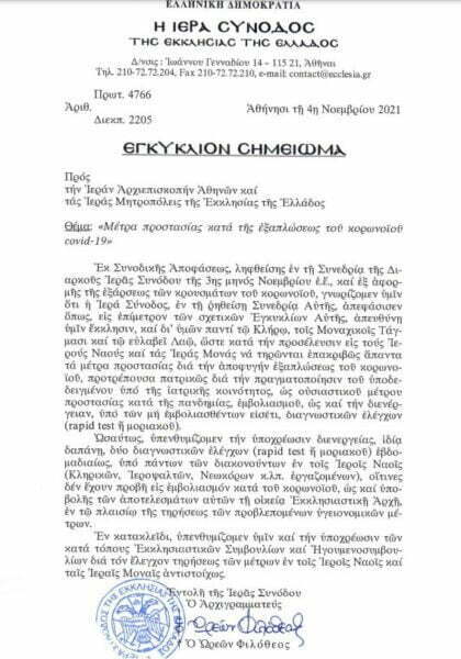 Στην εγκύκλιο που εξέδωσε, η Ιερά Σύνοδος καλεί όλους τους πιστούς και τον κλήρο «να τηρεί επακριβώς άπαντα τα μέτρα προστασίας», στέλνοντας μήνυμα σε όσους πιστούς δεν έχουν εμβολιαστεί ακόμα να προσέρχονται στους ιερούς ναούς αφότου έχουν υποβληθεί σε διαγνωστικό τεστ (rapid ή pcr).