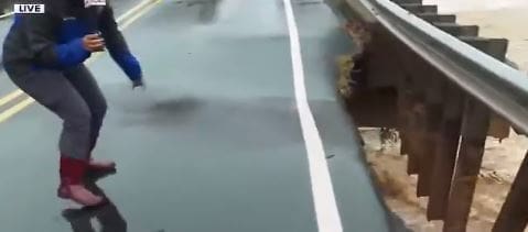 Στη διάρκεια του δελτίου ειδήσεων, η δημοσιογράφος Άμπερ Ρόμπερτς, έδειχνε on camera τον χείμαρρο του νερού κάτω από τη γέφυρα και τις ζημιές στον δρόμο, όπως φαίνεται στο σχετικό βίντεο.