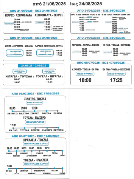 ΣΕΡΡΕΣ ΣΗΜΑΝΤΙΚΕΣ ΕΙΔΗΣΕΙΣΚαλοκαιρινά Δρομολόγια ΚΤΕΛ Σερρών προς Παραλίες (Τούζλα, Ασπροβάλτα, Σταυρό) Από: Serres2420 Ιουνίου 2025 ΚοινοποίησηΑπό το ΚΤΕΛ νομού Σερρών ανακοινώθηκαν τα δρομολόγια από και προς Τούζλα, Ασπροβάλτα, Σταυρό, για τους καλοκαιρινούς μήνες.