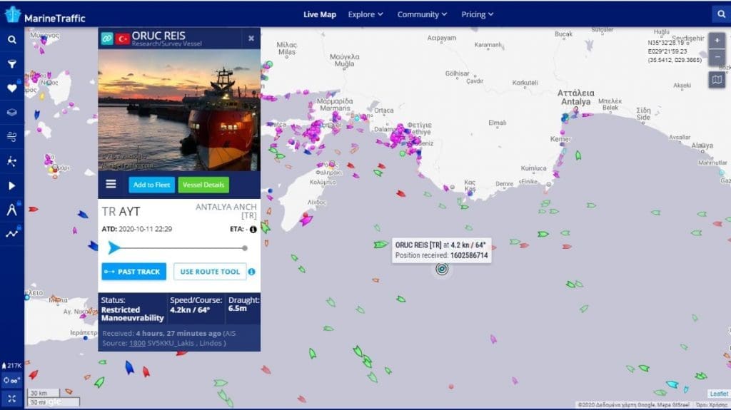 Εντός της ελληνικής υφαλοκρηπίδας συνεχίζει να κινείται το Oruc Reis. Αυτή την ώρα το τουρκικό ερευνητικό πλοίο βρίσκεται 30 ναυτικά μίλια νοτίως του Καστελλόριζου, συνοδευόμενο από πολεμικά πλοία.