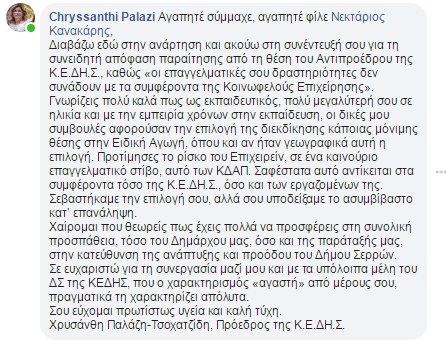 Κάτω από την ανακοίνωση παραίτησης στο λογαριασμό του Νεκτάριου Κανακάρη, έγραψε η κ. Χρυσάνθη Παλάζη τα εξής: