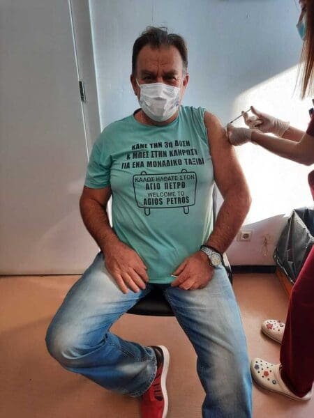 Συγκεκριμένα, ο Σπύρος Βέρροιος από την Πάτρα προσήλθε στο εμβολιαστικό κέντρο για να κάνει την τρίτη δόση του εμβολίου οπλισμένος με χιούμορ και φαντασία, αλλά και με όρεξη να “τρολάρει” τους αντιεμβολιαστές. Το μπλουζάκι που φόρεσε έγραφε: “Kάνε την τρίτη δόση και μπες στην κλήρωση για ένα μοναδικό ταξίδι… Καλώς ήλθατε στον Άγιο Πέτρο”.