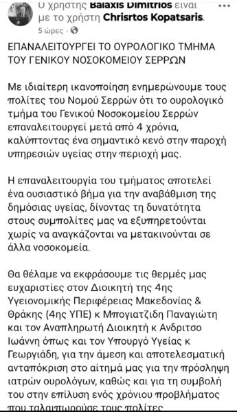 Με ιδιαίτερη ικανοποίηση ενημερώνουμε τους πολίτες του Νομού Σερρών ότι το ουρολογικό τμήμα του Γενικού Νοσοκομείου Σερρών επαναλειτουργεί μετά από 4 χρόνια, καλύπτοντας ένα σημαντικό κενό στην παροχή υπηρεσιών υγείας στην περιοχή μας.