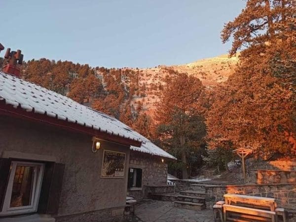 Στο καταφύγιο Σπήλιος Αγαπητός στα 2.100 του Ολύμπου, η σκεπή άσπρισε και το τοπίο είναι λευκό.