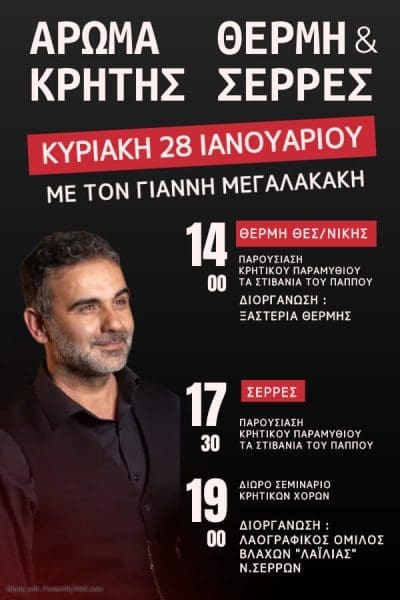 Την ίδια ημέρα, στον ίδιο χώρο, 7:00 – 9:00 το βράδυ, θα ακολουθήσει Διδασκαλία – Παρουσίαση αντιπροσωπευτικών χορών από την Κρήτη, με τον Γιάννη Μεγαλακάκη, 25 χρόνια μελετητή και ερευνητή της μουσικοχορευτικής παράδοσης της Μεγαλόνησου.