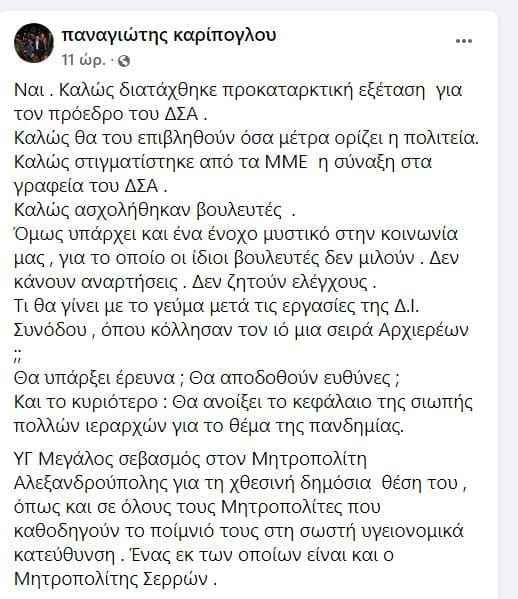 Ο Πρόεδρος του Δικηγορικού συλλόγου Σερρών, Παναγιώτης Καρίπογλου, με ανάρτηση του στον προσωπικό του λογαριασμό στο facebook, αναρωτιέται αν θα διεξαχθεί έρευνα για το γεύμα μετά τις εργασίες της Δ.Ι. Συνόδου , όπου κόλλησαν τον ιό μια σειρά Αρχιερέων και αν σπάσει η σιωπή.