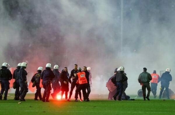 Οι εικόνες ξεκίνησαν με ρίψη καπνογόνων και φωτοβολίδων στον αγωνιστικό χώρο και ολοκληρώθηκε με ντου στον αγωνιστικό χώρο.