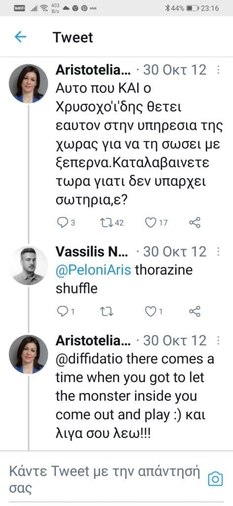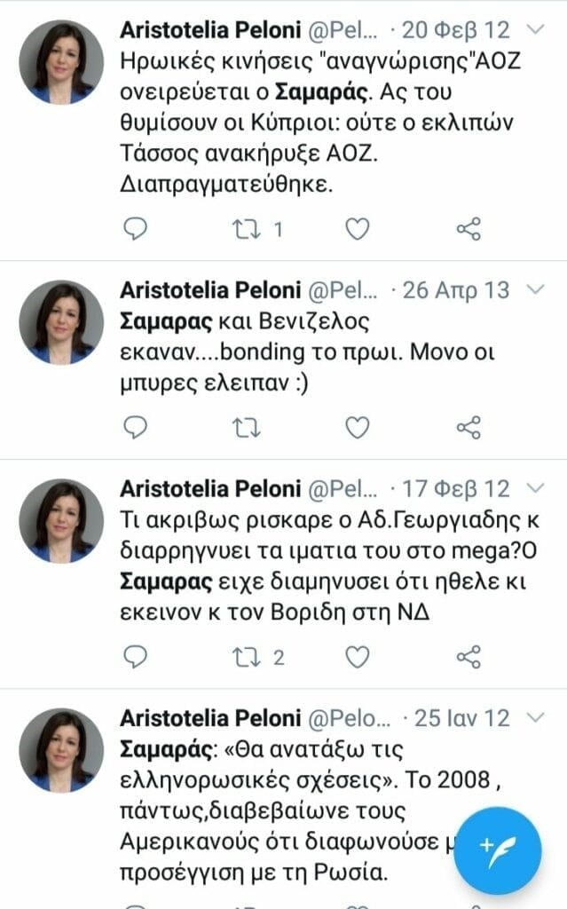 Μια μικρή αναδρομή στα παλαιά «τιτιβίσματα» της σημερινής κυβερνητικής εκπροσώπου είναι ενδεικτική για το πώς σκεφτόταν τότε η κυρία Πελώνη για τους σημερινούς πολιτικούς ή για τους πολιτικούς ταγούς της κυβερνώσας παράταξης.