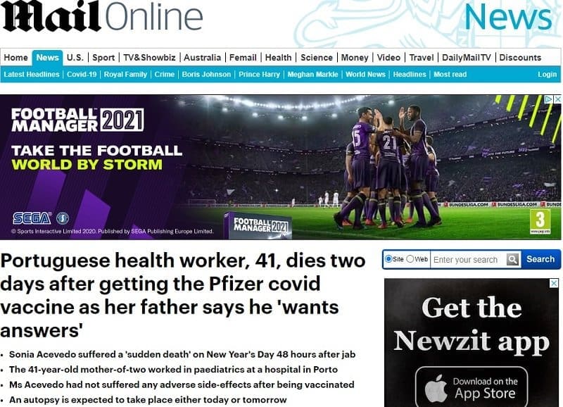 Η Σόνια Ασεβέντο στα 41 της, πέθανε ξαφνικά στο σπίτι ανήμερα της πρωτοχρονιάς ενώ δύο μέρες νωρίτερα είχε κάνει το εμβόλιο κατά του κορωνοϊού. Τις επόμενες μέρες θα διενεργηθεί νεκροψία. Ήταν μητέρα δύο παιδιών και δούλευε σε νοσοκομείο του Πόρτο ενώ δεν είχε ενημερώσει για τυχόν παρενέργειες του εμβολίου.