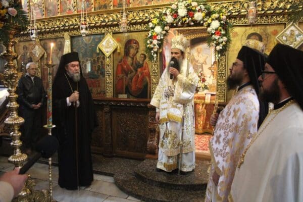 Μετά το πέρας της πανηγυρικής θ. Λειτουργίας, ο Μακ. Πατριάρχης Βουλγαρίας κ. Δανιήλ εξέφρασε με θερμούς λόγους προς τον Σεβ. κ. Θεολόγο, την χαρά και τις ευχαριστίες του για την συλλειτουργική του συμμετοχή στις εφετεινές εορταστικές ακολουθίες της μνήμης του μεγάλου Πατριάρχου της Εκκλησίας της Βουλγαρίας, οσίου Ευθυμίου του θαυματουργού.