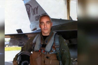Στην ίδια φωτογραφία του 47χρονου εικονίζεται, επίσης, ο χάρτης των δήθεν πολεμικών αποστολών στις οποίες τάχα συμμετείχε. Πίσω του βρίσκεται ένα μαχητικό F-16 σε αεροπορική βάση της Νέας Υόρκης, όπως μαρτυρούν οι χαρακτηριστικές ενδείξεις στην ουρά του αεροσκάφους.