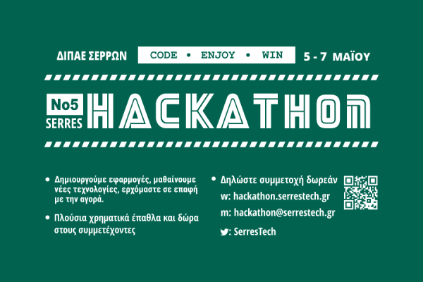 Η τεχνολογική κοινότητα Σερρών SerresTech.gr και το ΔΙΠΑΕ Σερρών – Τμήμα Μηχανικών Πληροφορικής, Υπολογιστών και Τηλεπικοινωνιών διοργανώνουν το 5ο Hackathon Serres με θέμα “Algorithms in practice” από την Παρασκευή 5 έως και την Κυριακή 7 Μαΐου 2023.