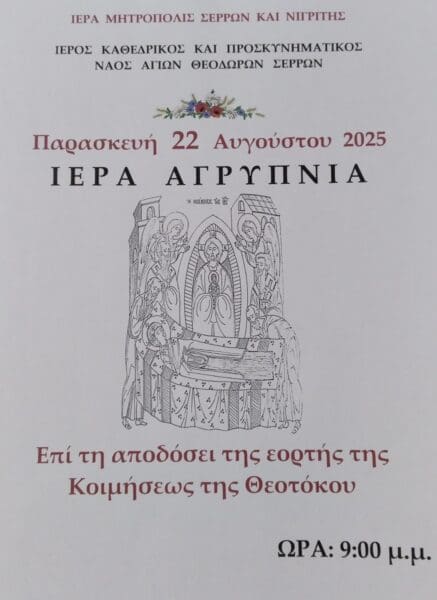 ΣΕΡΡΕΣΣέρρες: Αγρυπνία για την Απόδοση της εορτής της Κοιμήσεως της Θεοτόκου Από: Serres2418 Αυγούστου 2025 ΚοινοποίησηΙερά αγρυπνία για την Απόδοση της εορτής της Κοιμήσεως της Θεοτόκου θα τελεστεί την Παρασκευή 22 Αυγούστου 2024 στον ιερό Καθεδρικό και Προσκυνηματικό ναό των Αγίων Θεοδώρων Σερρών.Η αγρυπνία θα ξεκινήσει στις 9μ.μ.