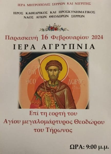 Ιερά Αγρυπνία θα τελεστεί την Παρασκευή 16 Φεβρουαρίου στο ναό των Αγίων Θεοδώρων στις Σέρρες.