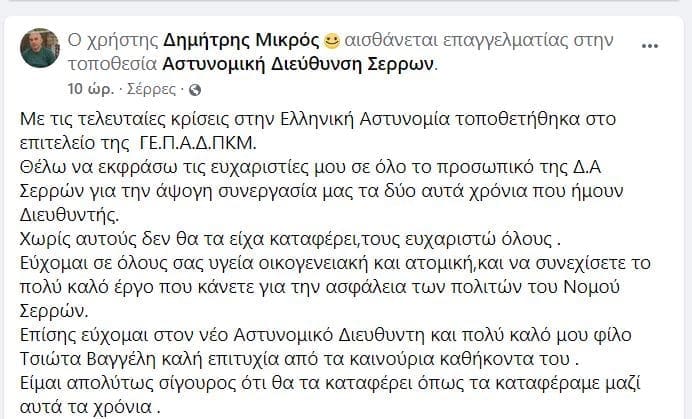 Ο κ. Μικρός τοποθετήθηκε στο επιτελείο της ΓΕ.Π.Α.Δ.ΠΚΜ και έκανε την παρακάτω ανάρτηση στον προσωπικό του λογαριασμό στο facebook: