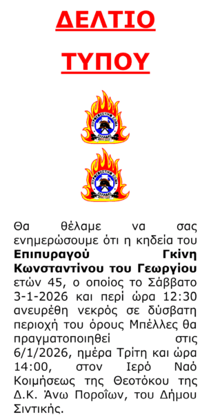Σε επίσημη ανακοίνωσή της, η Πυροσβεστική Υπηρεσία γνωστοποίησε τις λεπτομέρειες για την εξόδιο ακολουθία του Επιπυραγού Γκίνη Κωνσταντίνου του Γεωργίου, ο οποίος έφυγε από τη ζωή σε ηλικία 45 ετών.
